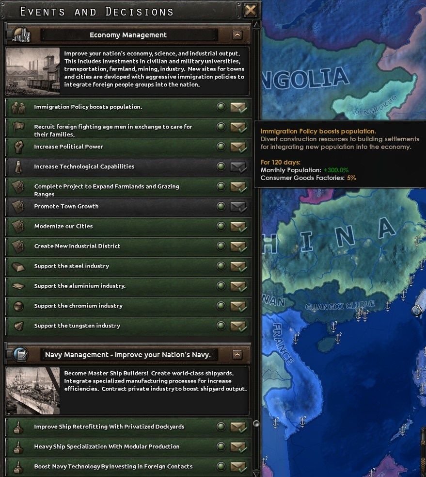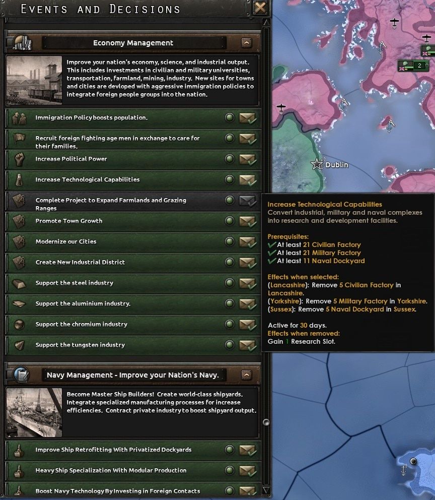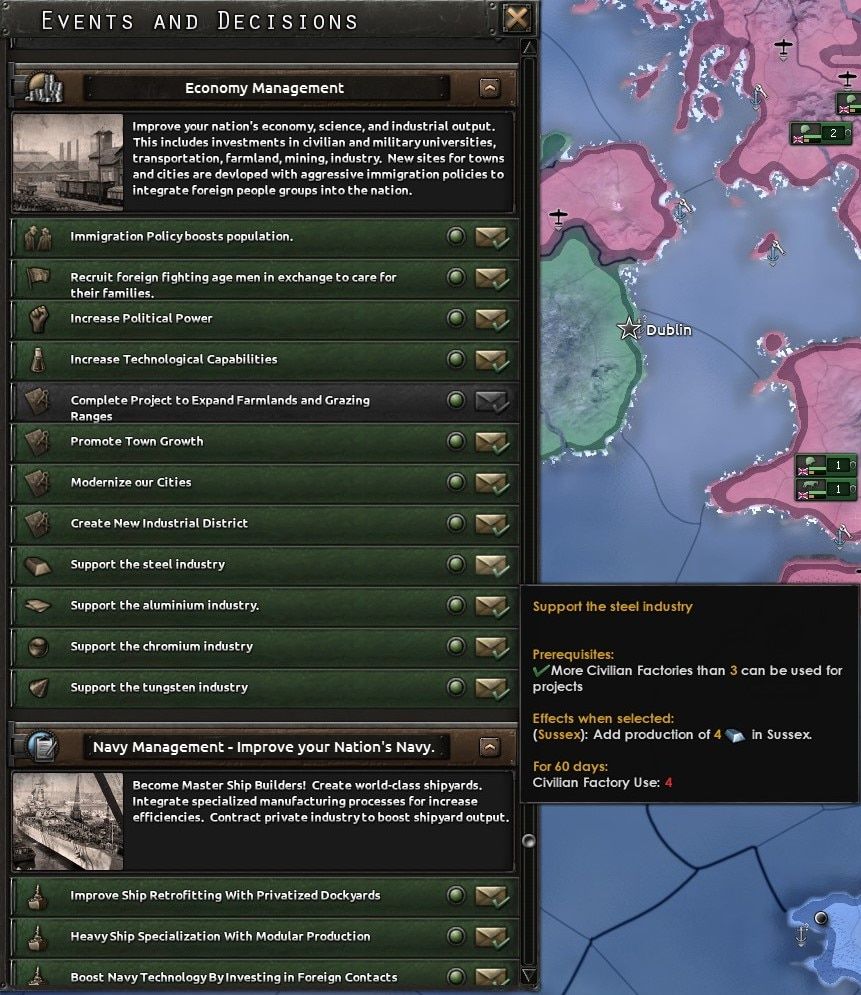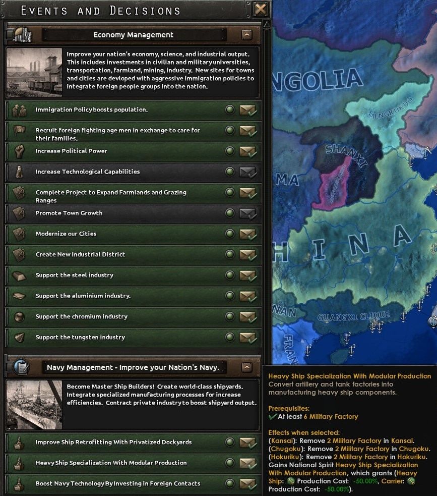 Этот мод добавляет в игру решения, позволяющие стране улучшить своё экономическое и военное положение. Уникальность этих решений заключается в том, что их принятие не требует затрат политической власти. Вместо этого для активации этих решений требуются фабрики. ИИ будет принимать эти решения. Надеемся, это позволит слабым странам оказывать более активное сопротивление, поскольку решения позволяют стране восполнять дефицит живой силы. Сильные страны смогут легче заменять и модернизировать флот, что, как ожидается, позволит им участвовать в большем количестве морских сражений.