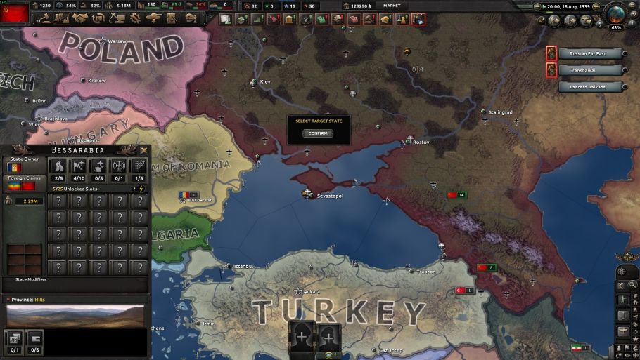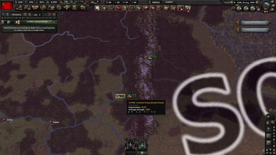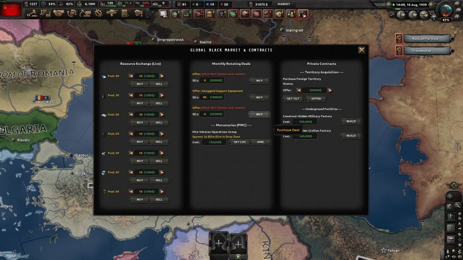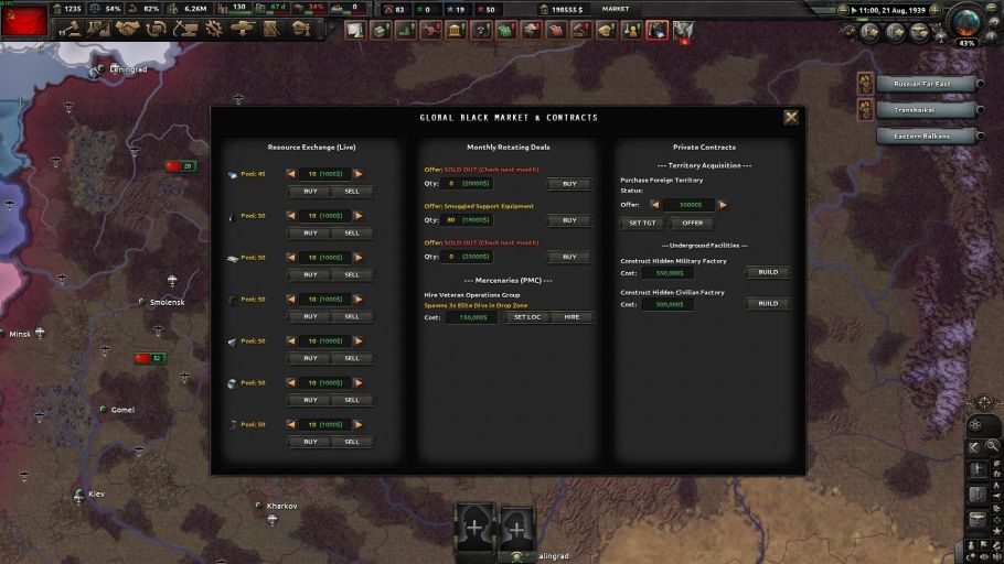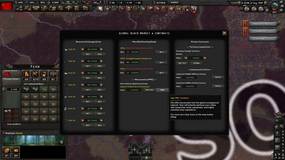 Чтобы купить государство или разместить ЧВК, просто нажмите «SET TGT / SET LOC» , выберите нужную провинцию прямо на карте мира, нажмите «CONFIRM» и завершите сделку в меню рынка. Интуитивно понятный пользовательский интерфейс делает взаимодействие с теневой экономикой простым и удобным.