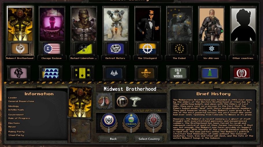 Сокращение влияния Братства Стали на Среднем Западе произошло быстро и неожиданно. Там, где когда-то существовала обширная многоштатная нация, теперь лежали многочисленные небольшие государства и культуры, оставшиеся в одиночестве из-за отсутствия Братства. Захват власти над Средним Западом неизбежен, и он наступает быстрее, чем хотелось бы. Назревают войны: будь то барабанный бой армии Освобождения Мутантов, постоянно нависающая тень Чикагского Анклава или растущая внутренняя напряженность и распри в некогда могущественном Братстве Стали Среднего Запада. Марширующие солдаты, мародерствующие мутанты, заряженное оружие, титаны столкнутся. Судьба Среднего Запада неизвестна, но одно можно сказать наверняка: это будет полномасштабная война.