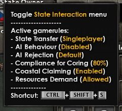 • CTRL + SHIFT + S: Переключить меню взаимодействий (один регион должен быть выбран на карте)